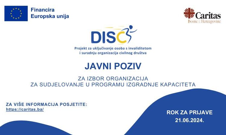 Caritas Bosne i Hercegovine, za potrebe projekta DISC kojeg financira Europska unija, raspisuje Javni poziv za izbor organizacija osoba s...